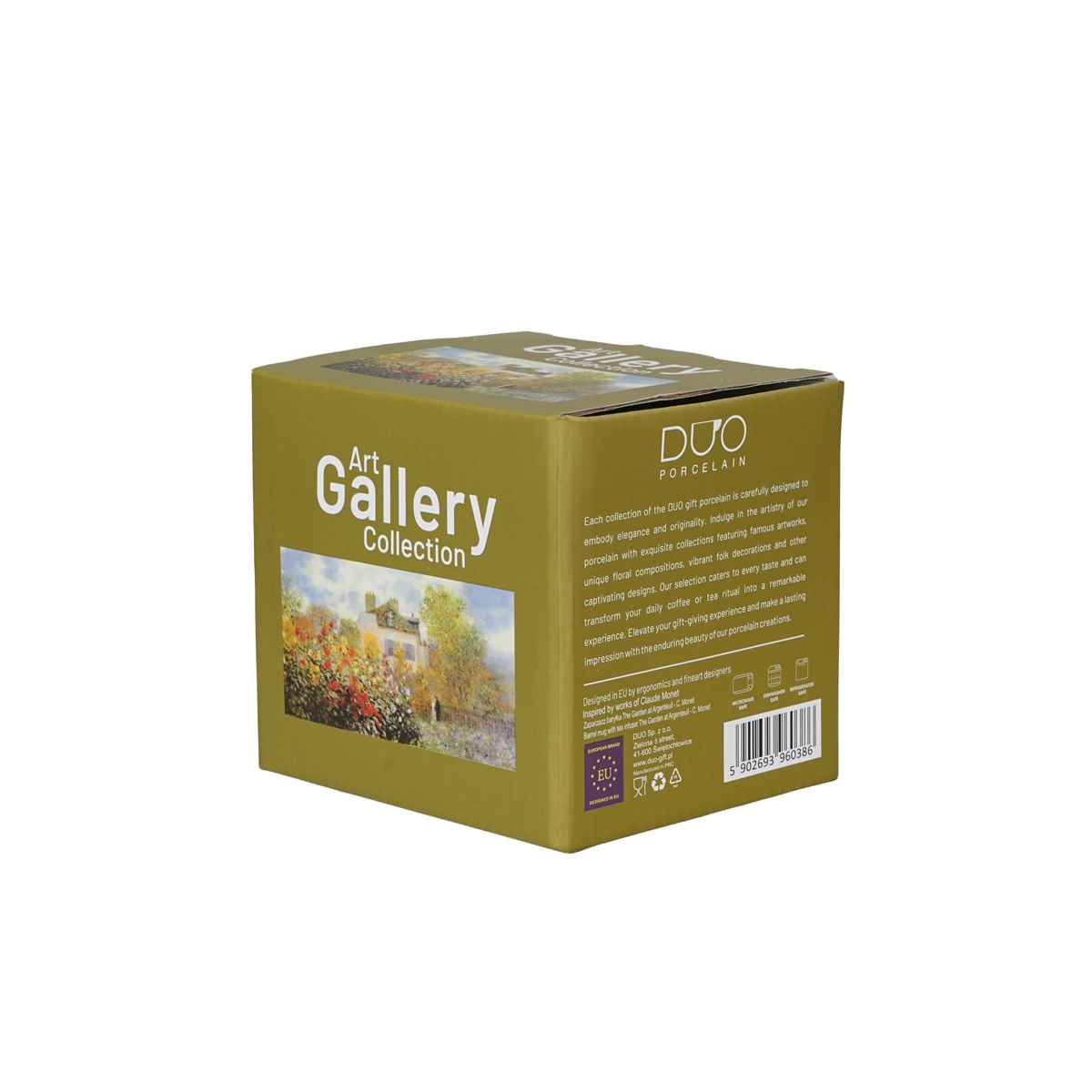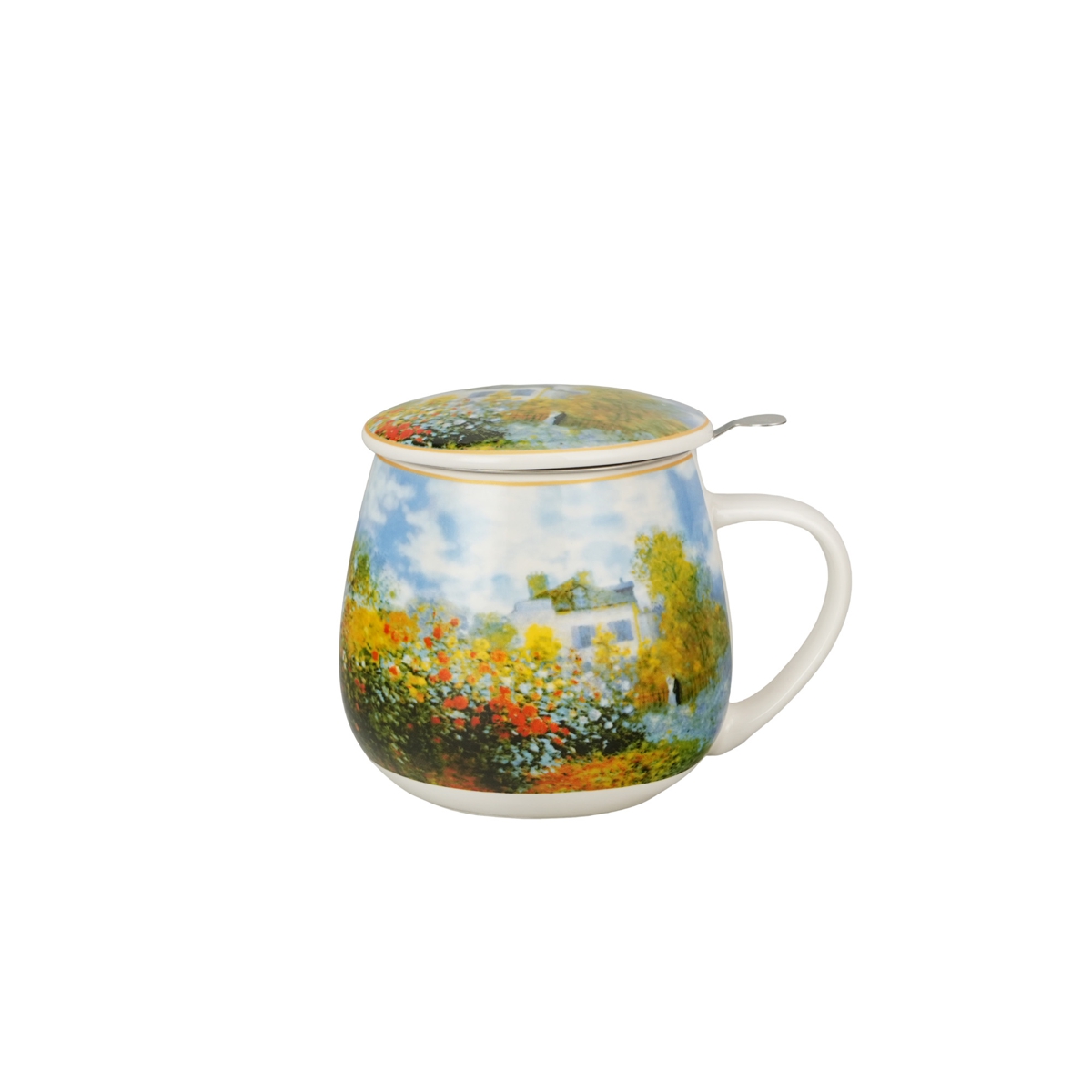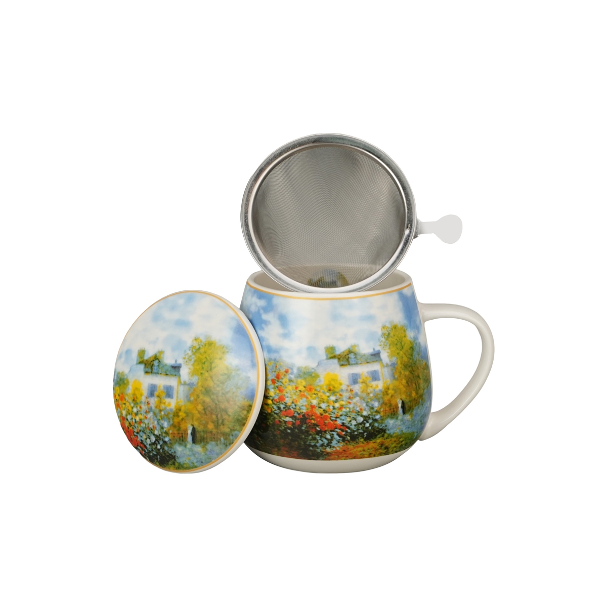 Becher mit 430 ml Fassungsvermögen, Teesieb und Deckel Garden at Argenteuil Monet aus der Kollektion Art Gallery. Dieses Produkt ist aus New Bone China-Porzellan hergestellt, einem Material, das für seine ausgezeichnete Haltbarkeit und sein glänzendes, cremeweißes Aussehen bekannt ist.