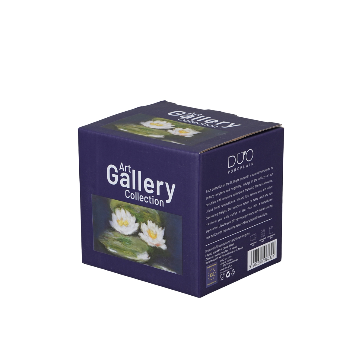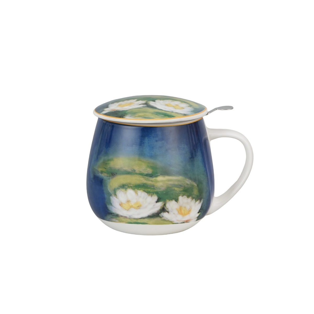 Becher mit 430 ml Fassungsvermögen, Teesieb und Deckel Nenufars Monet aus der Kollektion Art Gallery. Dieses Produkt ist aus New Bone China-Porzellan hergestellt, einem Material, das für seine ausgezeichnete Haltbarkeit und sein glänzendes, cremeweißes Aussehen bekannt ist.