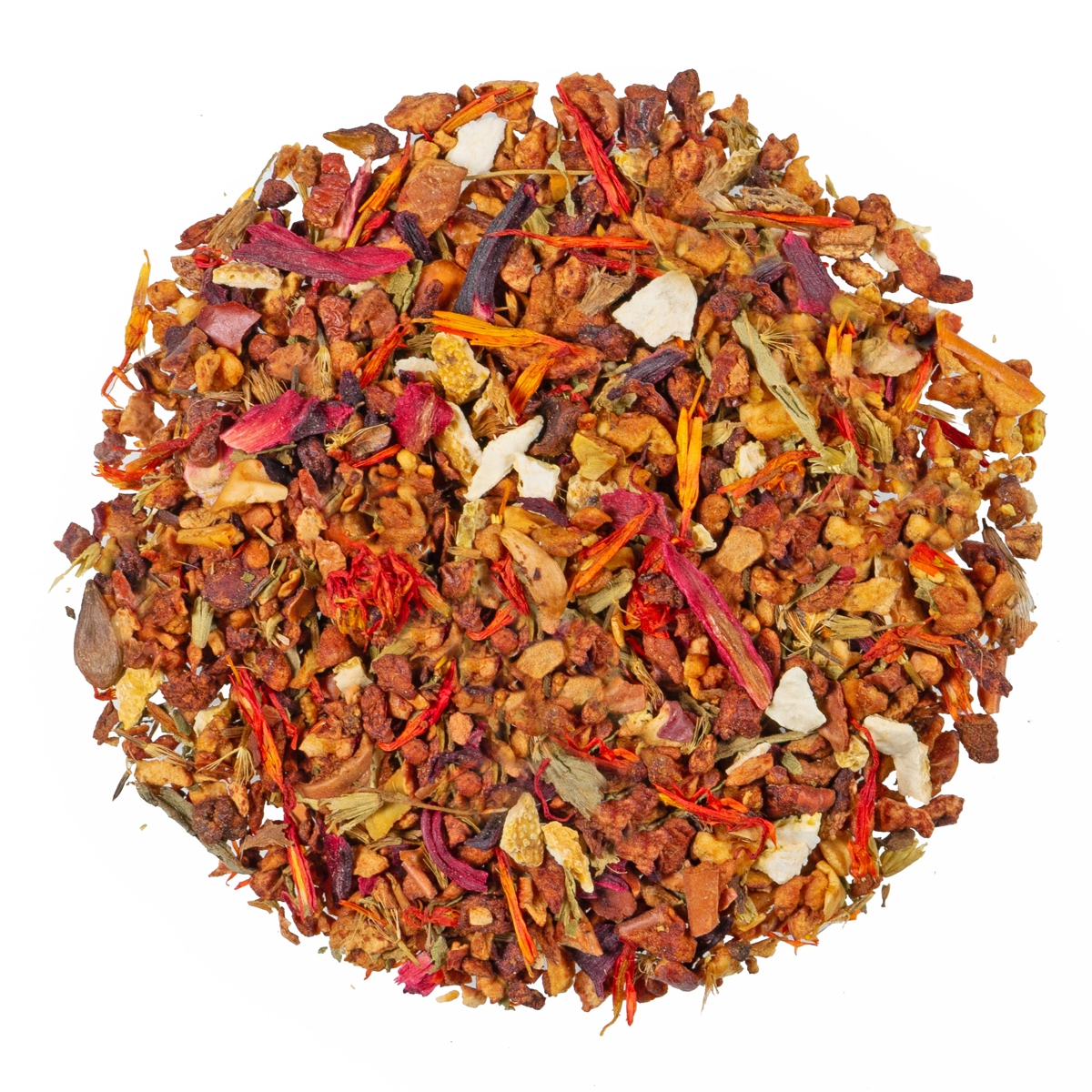 Zutaten: Apfelstücke (Apfel, Säuerungsmittel: Zitronensäure), Orangenschalen(10%), Hibiskusblüten, Süßkraut, natürliches Aroma, Saflorblüten