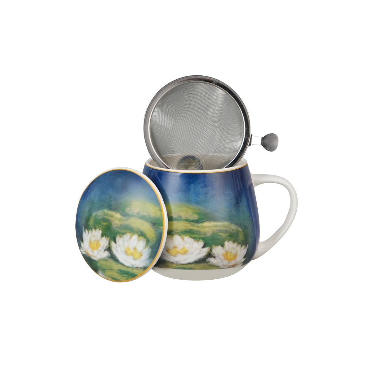 Becher mit 430 ml Fassungsvermögen, Teesieb und Deckel Nenufars Monet aus der Kollektion Art Gallery. Dieses Produkt ist aus New Bone China-Porzellan hergestellt, einem Material, das für seine ausgezeichnete Haltbarkeit und sein glänzendes, cremeweißes Aussehen bekannt ist.