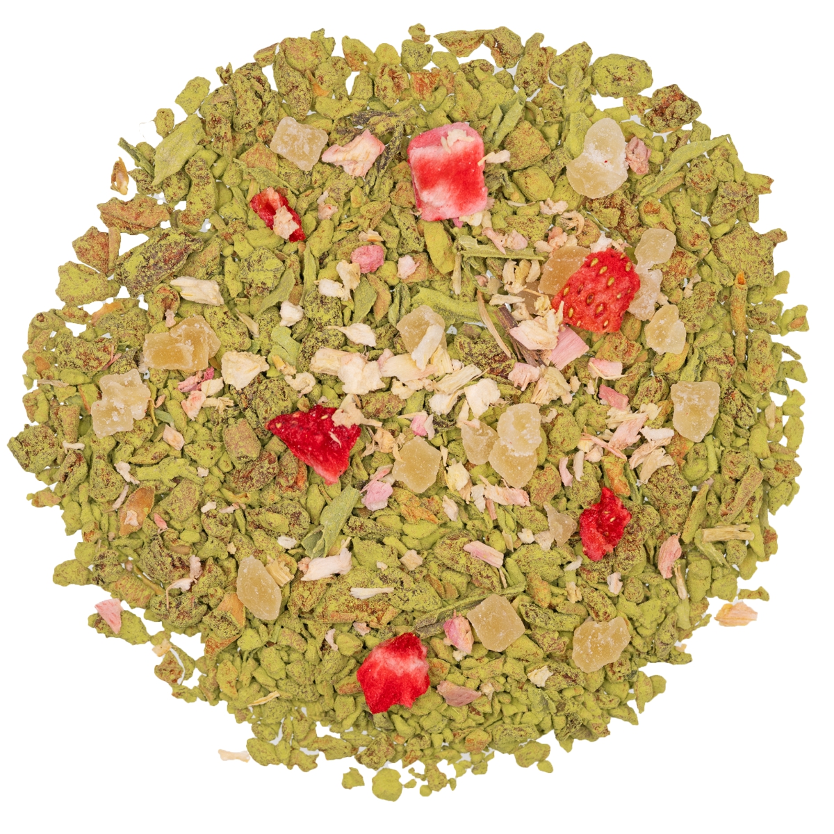 Zutaten: Apfelstücke (Apfel, Säuerungsmittel: Citronensäure), kandierte Ananasstücke (Ananas, Zucker), Grüner Tee Japan Matcha(5%), natürliches Aroma, Süßkraut, Erdbeerstücke(0,5%), Rhabarberstücke
